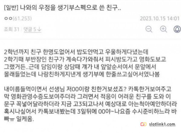 나와의 우정을 생기부 스펙으로 쓴 친구 페이지 정보 작성자 pkg 댓글 0건 조회 150회 작성일 26-04-23 17:22 목록 답변 글쓰기 본문 아.. 이전글회사 탕비실에서 벌어진 암살시도 26.04.23 다음글징역 살면서 뚜드려 맞기 힘든 이유 26.04.23 댓글 0 댓글목록 등록된 댓글이 없습니다.