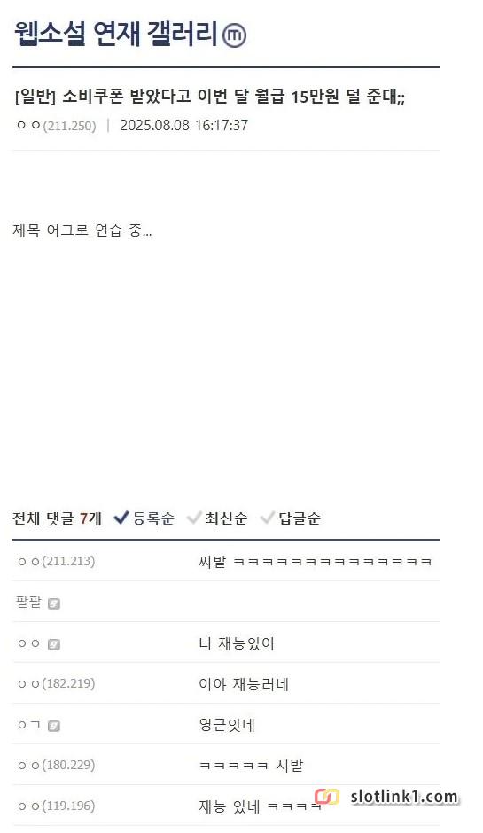 소비쿠폰 받았다고 이번 달 월급 15만원 덜 준대;; 페이지 정보 작성자 pkg 댓글 0건 조회 190회 작성일 26-04-28 22:20 목록 답변 글쓰기 본문 이전글무려 4,600여 년 전 고대 이집트 가구 유물 26.04.28 다음글"누나는 왜 다리를 안 먹어?" 26.04.28 댓글 0 댓글목록 등록된 댓글이 없습니다.