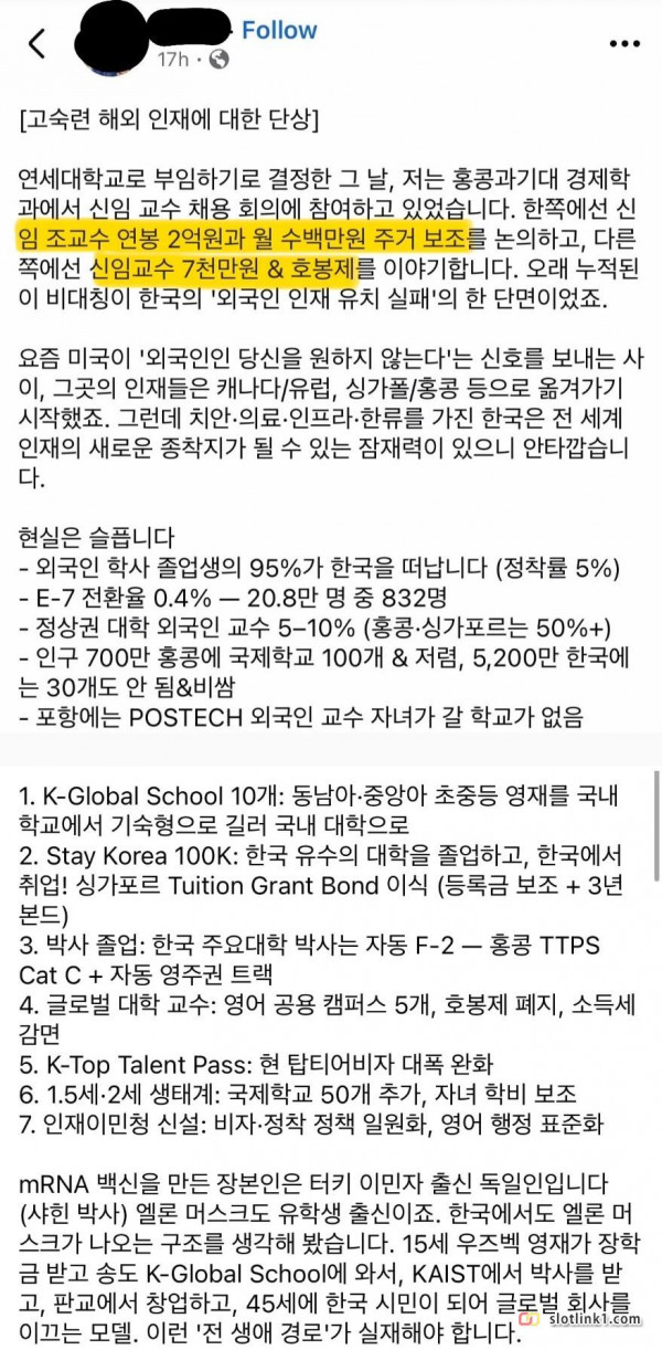 같은 교수인데 홍콩은 연봉 2억, 한국은 연봉 7천 페이지 정보 작성자 pkg 댓글 0건 조회 146회 작성일 26-04-29 16:53 목록 답변 글쓰기 본문 미국의 이민자 배척으로 해외 고학력자들의 탈출이 이어지는 가운데, 이들을 잡기위해서 캐나다/유럽/싱가폴/홍콩은 연봉 2억 + 주거비 지원까지 약속하고 있음. 한국은 외국인 고학력 이민자들을 받을만한 인프라가 없어서 기술력 격차에 대응하기 쉽지 않다고 함. 이전글나 애인이랑 호텔 가다가 삼촌 만났는데 26.04.29 다음글뉴토끼 운영진 피셜까지 떠버림 26.04.29 댓글 0 댓글목록 등록된 댓글이 없습니다.
