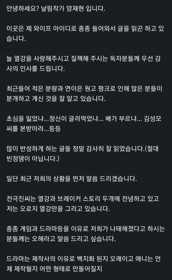 '열혈강호' 불과 15년 전 한국 만화계 현실 페이지 정보 작성자 pkg 댓글 0건 조회 307회 작성일 26-04-30 18:47 목록 답변 글쓰기 본문 열혈강호 작가가 2010년 팬 카페에 적은 글 당시 고수 문정후 작가나 키드갱 신영우 작가도 만화로 생계를 이어가는게 힘들다는 글을 쓰던 시절 지금이야 이렇개 큰 수익을 올릴 수 있어 송지형이나 양경일 작가 같이 일본에서 큰 커리어 쌓은 작가들도 돌아올 정도로 성장한 한국 만화 시장이지만 15년전만해도 생계유지 지체가 힘든시절.. 다행히 지금은 열혈강호 작가님도 돈 방석에 앉았다고 하심 이전글거래처 직원이 계약서에 고의로 커피를 쏟음 26.04.30 다음글여진족 1만이 모이면 천하에 당할 자가 없다 26.04.30 댓글 0 댓글목록 등록된 댓글이 없습니다.