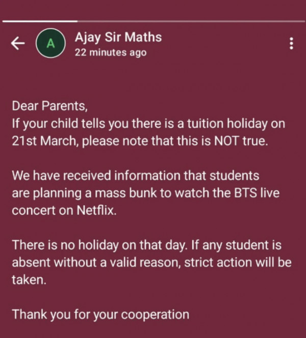 SNS에서 핫하다는 인도 수학 학원 공지사항 페이지 정보 작성자 pkg 댓글 0건 조회 138회 작성일 26-03-16 03:45 목록 답변 글쓰기 본문 학부모님께, 만약 자녀가 3월 21일에 학원(수업) 휴강이라고 말한다면, 그것은 사실이 아님을 유의해 주시기 바랍니다. 저희는 학생들이 넷플릭스에서 생중계되는 BTS 콘서트를 보기 위해 단체 결석을 계획하고 있다는 정보를 입수했습니다. 해당 날짜에는 휴강이 없습니다. 정당한 사유 없이 결석하는 학생에게는 엄중한 조치가 취해질 예정입니다. 협조해 주셔서 감사합니다. (번역: 제미나이) 이전글작년 국내 기업 영업이익 순위 26.03.16 다음글호불호 갈리는 오래된 호프집 감성 26.03.16 댓글 0 댓글목록 등록된 댓글이 없습니다.