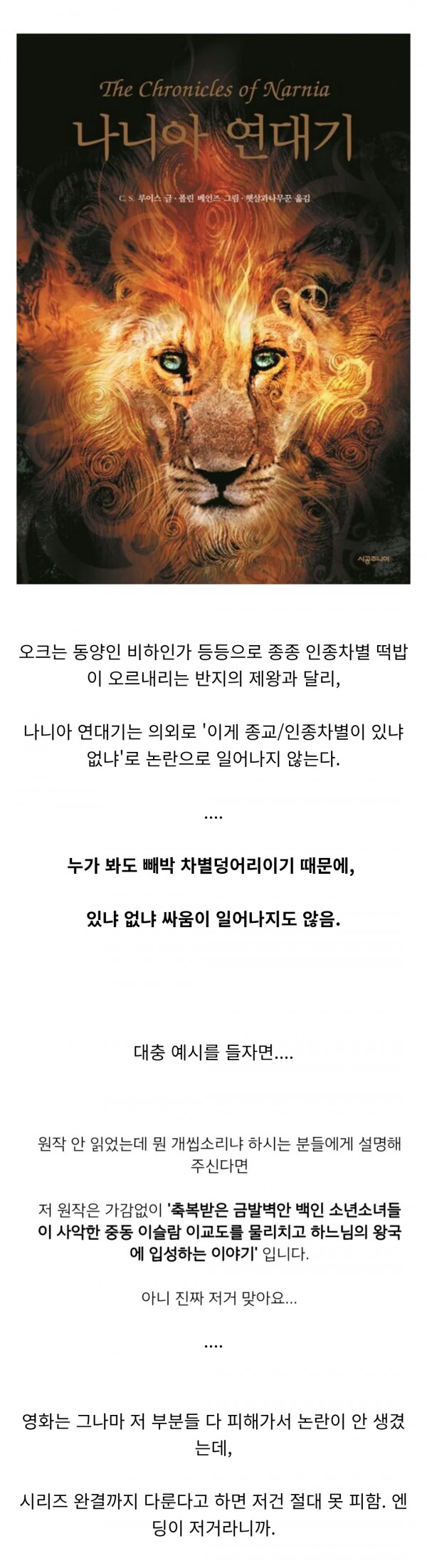 나니아 연대기가 인종차별 논란이 없는 이유 페이지 정보 작성자 pkg 댓글 0건 조회 110회 작성일 26-04-05 07:55 목록 답변 글쓰기 본문 누가봐도 백인우월주의 개독 꼴통 소설이라서 논란이 없음 이전글1400억원 짜리 남극 탐험 요트 26.04.05 다음글내 환자가 죽었는데 인생 별거없는것같다 26.04.05 댓글 0 댓글목록 등록된 댓글이 없습니다.