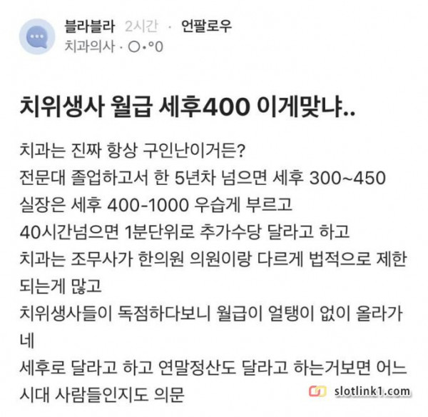 요새 치위생사가 대세인 이유 페이지 정보 작성자 pkg 댓글 0건 조회 210회 작성일 26-04-10 10:30 목록 답변 글쓰기 본문 이전글차량 2부제... 요즘 공무원들 근황 26.04.10 다음글관리사무소 모든 직원이 집단 퇴사한 아파트 26.04.10 댓글 0 댓글목록 등록된 댓글이 없습니다.