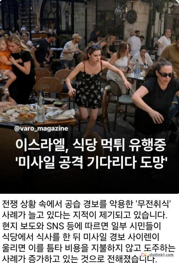 요즘 이스라엘에서 유행이라는 진상짓. 페이지 정보 작성자 fiveou 댓글 0건 조회 109회 작성일 26-04-03 18:41 목록 답변 글쓰기 본문 짤은 ai지만 실제로 공습경보를 핑계로 무전취식 먹튀사례가 빈번하다고. 이전글 (광고) 흔한 게임 광고 26.04.03 다음글 이제와서 생각해보니 보통 단순한 반란이 아니었던 사건 26.04.03 댓글 0 댓글목록 등록된 댓글이 없습니다.