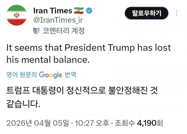 트럼프 SNS를 본 이란 반응 페이지 정보 작성자 fiveou 댓글 0건 조회 156회 작성일 26-04-06 01:56 목록 답변 글쓰기 본문 확실히 이란이 잘 긁긴 해요 크크크크얼마전 SNS도 그렇고 이전글 국세청이 직접 오피셜로 정해준 명칭. 26.04.06 다음글 아니 내가 왜 다 내야하지? 26.04.06 댓글 0 댓글목록 등록된 댓글이 없습니다.