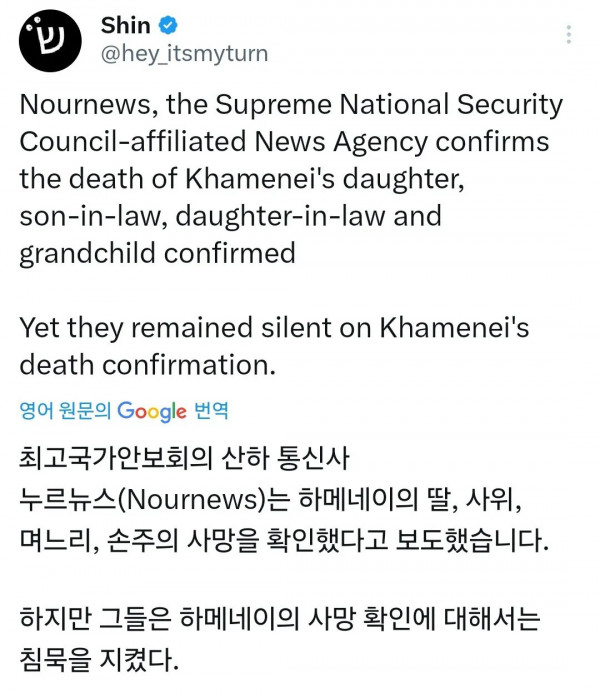 하메네이 친딸, 손주, 며느리, 사위 사망확인 페이지 정보 작성자 pkg 댓글 0건 조회 186회 작성일 26-03-02 03:10 목록 답변 글쓰기 본문 하메네이 친딸, 손주, 며느리, 사위 사망확인 이전글'삼일절' 중학교 교사 마라톤 논란 26.03.02 다음글탑게이 홍석천 성님 생일파티 근황 26.03.02 댓글 0 댓글목록 등록된 댓글이 없습니다.