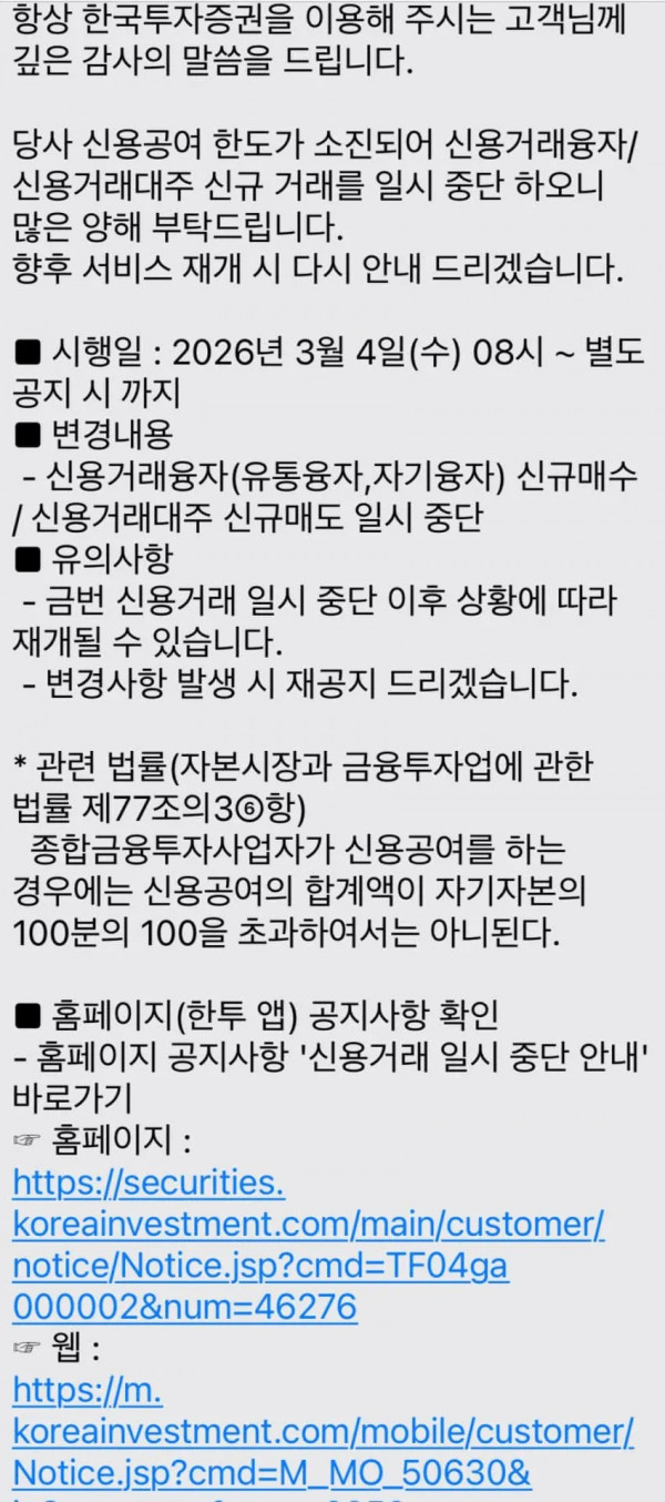 한국투자증권 : 이제 돈 못 빌려드려요 페이지 정보 작성자 pkg 댓글 0건 조회 112회 작성일 26-03-05 03:53 목록 답변 글쓰기 본문 어제 날라온 문자임 “신용공여 한도 소진” 한국투자증권에서 빌려줄 수 있는 돈 다 빌려줘서 더 이상 못 빌려준다는 말임 이말인 즉슨, 어제 하락장에 사람들이 ㅈ나게 신용써가며 빚투로 물 ㅈ나 탔다는 말인데… 그저 ㅈ되었다 한국투자증권 : 이제 돈 못 빌려드려요 이전글이삿짐 나르고 35만 원 번 대학생 26.03.05 다음글의외로 갓길운전해도 되는 사유 26.03.04 댓글 0 댓글목록 등록된 댓글이 없습니다.