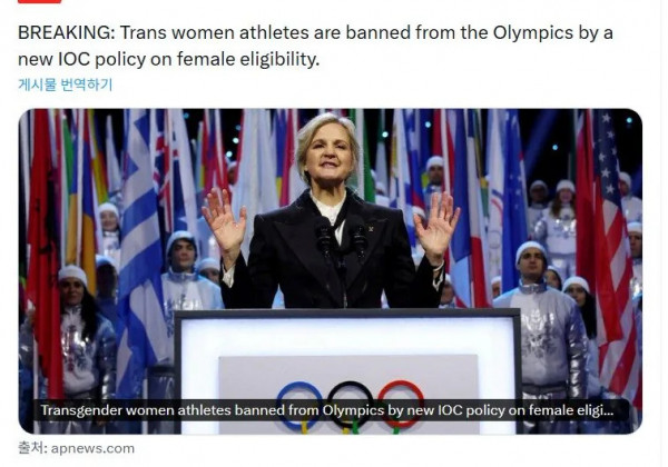 트렌스젠더 여성들, 올림픽 출전 금지 페이지 정보 작성자 pkg 댓글 0건 조회 156회 작성일 26-03-27 20:43 목록 답변 글쓰기 본문 그동안 트젠들이 올림픽 나가서 일반 여자 선수들이랑 대결해서 논란이 있었는데 결국 출전 금지됨 ㅋㅋㅋㅋ 트렌스젠더 여성들, 올림픽 출전 금지 이전글건더기 있는 캔음료 쉽게 마시는 법 26.03.27 다음글대한민국 사람들은 참 착해 26.03.27 댓글 0 댓글목록 등록된 댓글이 없습니다.