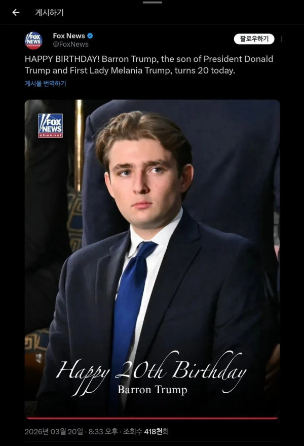 최근 미국 폭스 뉴스 SNS 근황 페이지 정보 작성자 pkg 댓글 0건 조회 157회 작성일 26-03-30 04:53 목록 답변 글쓰기 본문 '오늘은 트럼프 대통령의 아들 배런 트럼프의 20번째 생일입니다 경*축' 이전글ADHD 검사받은 일본인 26.03.30 다음글한국인도 갈리는 김치 취향 26.03.30 댓글 0 댓글목록 등록된 댓글이 없습니다.