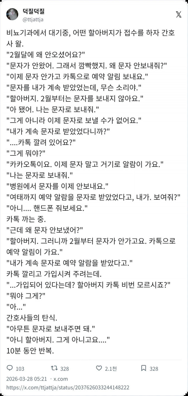이제 문자로 안가고 카톡으로 가요 페이지 정보 작성자 pkg 댓글 0건 조회 115회 작성일 26-03-30 06:08 목록 답변 글쓰기 본문 이전글게임에 기술 이름이 없으면 생기는 일 26.03.30 다음글ADHD 검사받은 일본인 26.03.30 댓글 0 댓글목록 등록된 댓글이 없습니다.