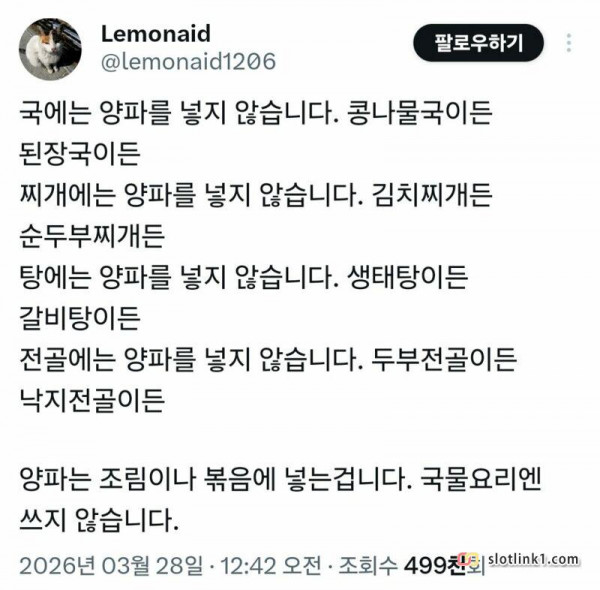 양파는 볶음, 조림이 기본이다 페이지 정보 작성자 pkg 댓글 0건 조회 188회 작성일 26-03-31 10:00 목록 답변 글쓰기 본문 하지만 넣고 싶으면 넣어도 됨 이전글아시아 환율 방어 꼴등 기록중인 대한민국 26.03.31 다음글검찰 측에서 선처해달라고 한 탈세 사례 26.03.31 댓글 0 댓글목록 등록된 댓글이 없습니다.