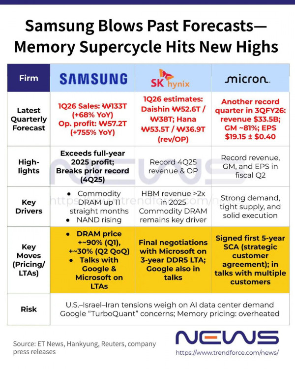 제조업의 왕이 된 메모리 반도체 산업 페이지 정보 작성자 pkg 댓글 0건 조회 193회 작성일 26-04-10 20:51 목록 답변 글쓰기 본문 1분기 삼성전자 DS 메모리 사업부 잠정실적 매출 약 76조 영업이익 약 55.2조 이익률 72.6% 1분기 SK 하이닉스 예상실적 매출 약 52.6조 영업이익 약 38조 이익률 72.2% 2분기(3~5월) 마이크론 예상실적 매출 약 50.3조 영업이익 약 37.2조 이익률 74% 영업이익률 70% 돌파 ㄷㄷㄷ 이전글신라에 대해 밝혀진 어제자 충격적인 사실 26.04.10 다음글"일진 동창이 동창회에서 진상을 부렸습니다." 26.04.10 댓글 0 댓글목록 등록된 댓글이 없습니다.