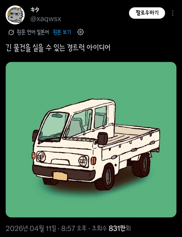 기다란 화물 운반용 경트럭 아이디어 페이지 정보 작성자 pkg 댓글 0건 조회 151회 작성일 26-04-13 03:17 목록 답변 글쓰기 본문 고정은 어캄...? 이전글파주 사람만 안다는 전쟁 터지기 직전 신호 26.04.13 다음글현재 홈플러스 상황 26.04.13 댓글 0 댓글목록 등록된 댓글이 없습니다.