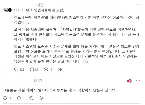 피부미용만 보는 의사들은 레이저 발사대인가 페이지 정보 작성자 pkg 댓글 0건 조회 149회 작성일 26-04-21 01:20 목록 답변 글쓰기 본문 글쓴이는 피부과 근무경험이 있는 정신과 의사인 듯 함댓글로 피부과 진료 거부당한 경험담들과 수가 때문에 어쩔 수 없다고 항의하는 의사들 댓글 달리는 중 피부미용만 보는 의사들은 레이저 발사대인가 이전글근미래 우주 식민지 건축 재료 26.04.21 다음글항상 논쟁이라는 핸드폰 설정 26.04.20 댓글 0 댓글목록 등록된 댓글이 없습니다.
