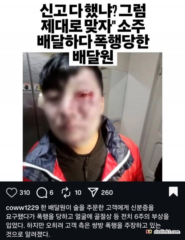 혐주의) 손님에게 쌍방폭행당한 배달기사 페이지 정보 작성자 pkg 댓글 0건 조회 160회 작성일 26-04-21 22:29 목록 답변 글쓰기 본문 이전글고양이 쉼터에서 무려 6시간 주무신 분 26.04.21 다음글가난하다고 친구들한테 놀림받았던 아들이 한 짓 26.04.21 댓글 0 댓글목록 등록된 댓글이 없습니다.