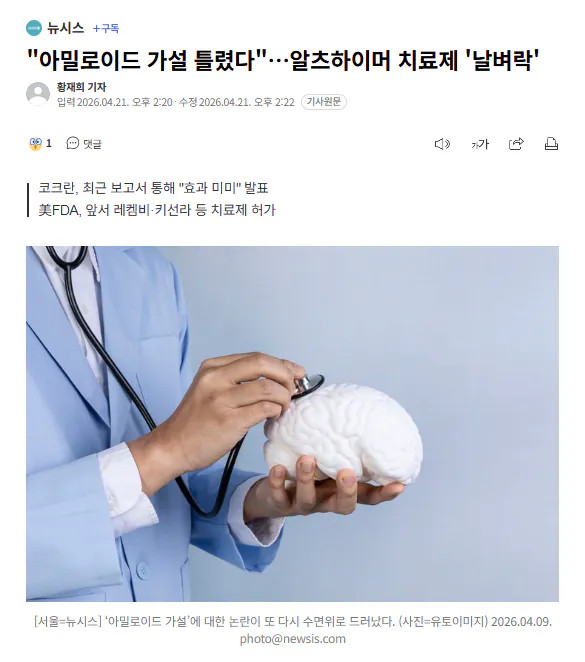 "아밀로이드 가설 틀렸다"…알츠하이머 치료제 '날벼락' 페이지 정보 작성자 pkg 댓글 0건 조회 217회 작성일 26-04-22 11:34 목록 답변 글쓰기 본문 https://n.news.naver.com/mnews/article/003/0013900506 알츠하이머 치료제가 효과가 없다는 연구 결과가 나오면서 ‘아밀로이드 가설’에 대한 논란이 또 다시 수면위로 드러났다. 이전글싱글벙글 타이어 공짜로 바꾸는방법 26.04.22 다음글오싹오싹 한국 & 일본 일자리 수 26.04.22 댓글 0 댓글목록 등록된 댓글이 없습니다.