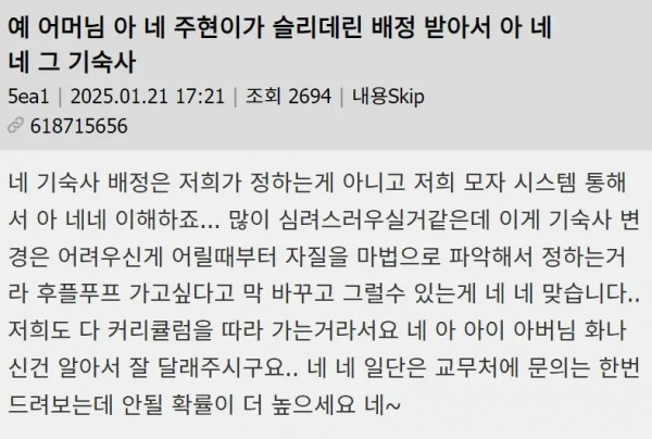 호그와트가 한국 학교였다면 페이지 정보 작성자 fiveou 댓글 0건 조회 177회 작성일 26-03-23 11:10 목록 답변 글쓰기 본문 슬리데린 반 아이 학부모인데요.기숙사 인테리어가 너무하더라구요.. 이전글 ???: 그가 죽어서 너무 기쁩니다 26.03.23 다음글 우리가 물고 빠는 삼국지특 26.03.23 댓글 0 댓글목록 등록된 댓글이 없습니다.