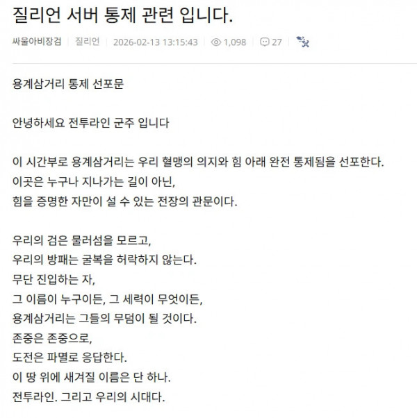 [유머] 낭만 오지는 리니지 클래식 근황. 페이지 정보 작성자 fiveou 댓글 0건 조회 215회 작성일 26-02-19 20:19 목록 답변 글쓰기 본문 하이고 할배요...크크 이전글[유머] 김병현 이름듣고 화들짝 놀라는 미국아저씨 26.02.19 다음글[유머] 컬링팀 이름의 비밀 26.02.19 댓글 0 댓글목록 등록된 댓글이 없습니다.