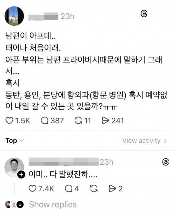 남편이 아프대.. 태어나 처음이래 페이지 정보 작성자 pkg 댓글 0건 조회 164회 작성일 26-04-26 01:02 목록 답변 글쓰기 본문 이전글아무리 급해도 알바로 20대 쓰지마세요 26.04.26 다음글유적지 복원 전 & 후 사진 26.04.26 댓글 0 댓글목록 등록된 댓글이 없습니다.