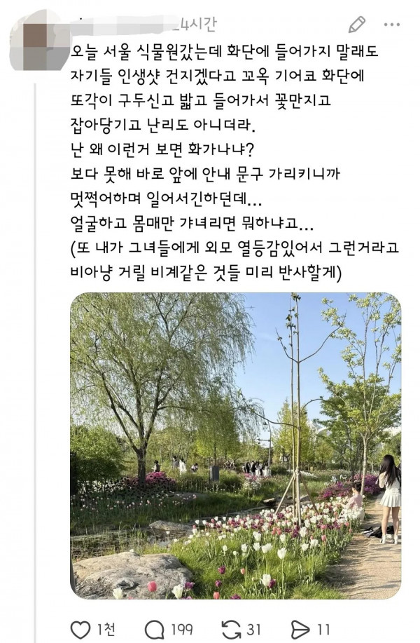 서울식물원 화단 논란 페이지 정보 작성자 pkg 댓글 0건 조회 162회 작성일 26-04-28 03:17 목록 답변 글쓰기 본문 서울 식물원측에서 화단에 들어가지말라고 경고문을 붙여놓았음에도 들어가서 꽃밟고 사진찍는 사람들이 많아서 논란. 인스타에 서울식물원 검색하면 경고문 무시하고 들어가서 찍은 사진들 굉장히 많다고함. 이전글요시 팝콘통 되팔렘들 근황 26.04.28 다음글혐주의) 삼첩분식 사과문 26.04.28 댓글 0 댓글목록 등록된 댓글이 없습니다.