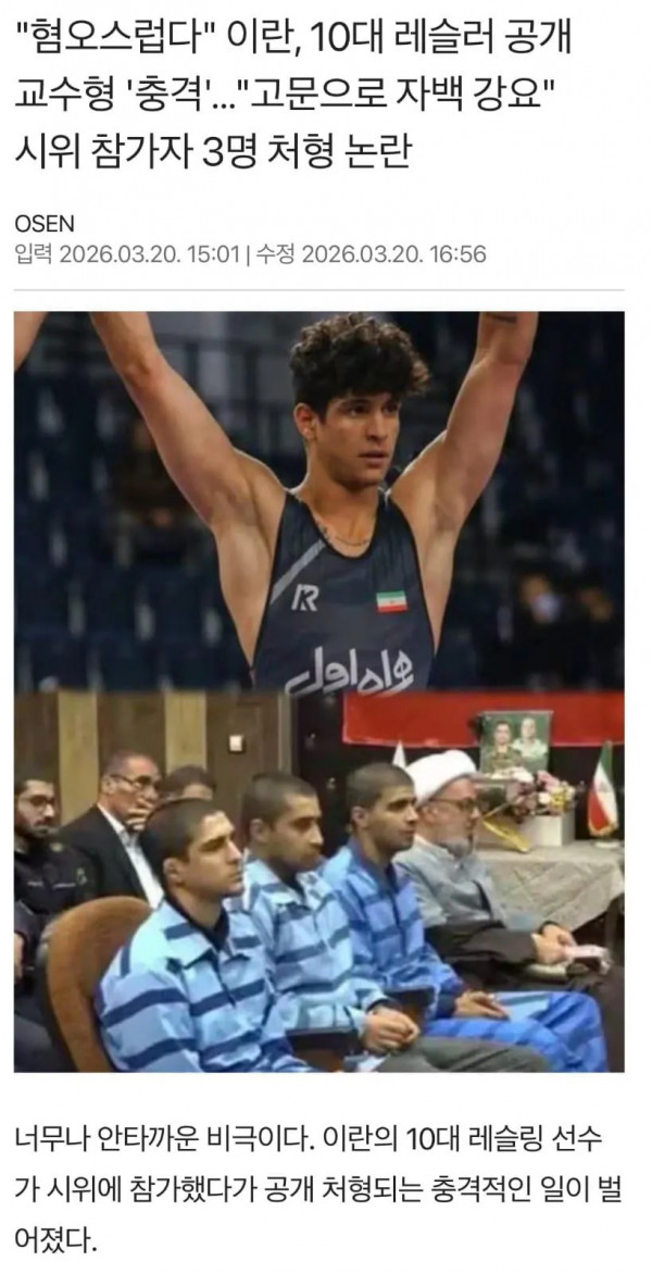 "혐오스럽다" 이란 10대 레슬러 공개 교수형 페이지 정보 작성자 pkg 댓글 0건 조회 197회 작성일 26-03-21 15:30 목록 답변 글쓰기 본문 https://www.chosun.com/sports/sports_general/2026/03/20/G44GEYRTGRRTSZTDHA2TSNBQGY/?outputType=amp 전쟁 일으킨게 트럼프의 바보짓인것과 별개로 이란도 진짜 답없는 국가 이전글최근 체감상 진짜 개부자 집에 있는 가전제품 근황 26.03.21 다음글자식 넷을 죽이고 자살한 30대 가장의 비하인드 26.03.21 댓글 0 댓글목록 등록된 댓글이 없습니다.