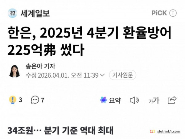 한은, 2025년 4분기 환율방어 225억弗 썼다 페이지 정보 작성자 pkg 댓글 0건 조회 140회 작성일 26-04-03 13:53 목록 답변 글쓰기 본문 이전글한국군이 전세계를 속인 것 ㄷㄷ 26.04.03 다음글해발 5486m에서 포착된 표범 ㄷㄷ 26.04.03 댓글 0 댓글목록 등록된 댓글이 없습니다.