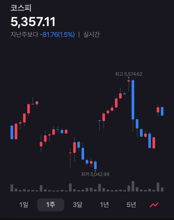 최근 일주일 코스피 그래프 꼬라지 페이지 정보 작성자 pkg 댓글 0건 조회 144회 작성일 26-04-03 21:01 목록 답변 글쓰기 본문 최저점 5042 최고점 5574 이전글진짜 쥰내 힙하다는 불교 굿즈 근황 26.04.03 다음글통일은 선택이 아니라 필수인 이유 26.04.03 댓글 0 댓글목록 등록된 댓글이 없습니다.