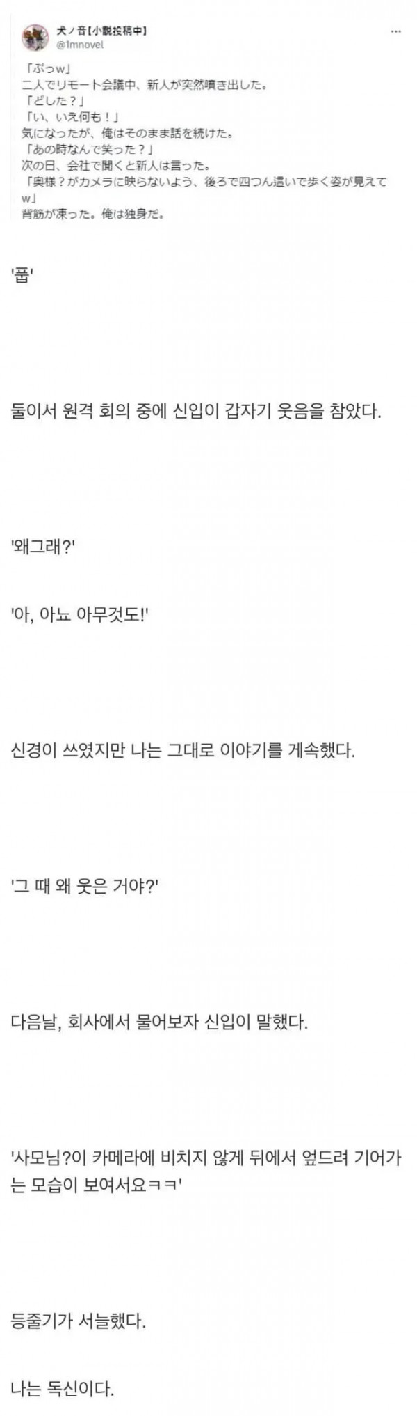 화상회의 중에 신입이 웃음을 터뜨렸다 페이지 정보 작성자 pkg 댓글 0건 조회 193회 작성일 26-04-08 16:55 목록 답변 글쓰기 본문 화상회의 중에 신입이 웃음을 터뜨렸다 이전글12시간 때렸다…담배 피우며 쉬다 다시 폭행 26.04.08 다음글070번호는 도대체 왜 안받는거냐? 26.04.08 댓글 0 댓글목록 등록된 댓글이 없습니다.