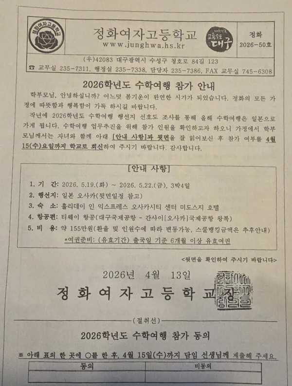 일본 수학여행 155만원 ㄷㄷ 페이지 정보 작성자 pkg 댓글 0건 조회 166회 작성일 26-04-17 02:18 목록 답변 글쓰기 본문 호텔(3성급) 오사카3박4일(유니버셜포함) 동의 vs 비동의 일본 수학여행 155만원 ㄷㄷ 이전글공무원 취직 개꿀인 교정직 근황 26.04.17 다음글이태리 총리, "핵무기 가졌으면 위상에 맞는 자세를 보여라" 26.04.17 댓글 0 댓글목록 등록된 댓글이 없습니다.