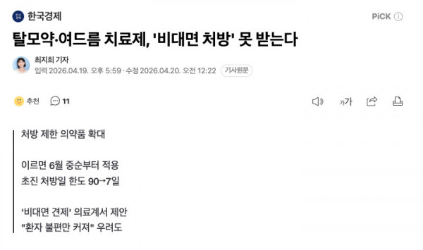 탈모약,여드름약 비대면 처방 금지 페이지 정보 작성자 pkg 댓글 0건 조회 189회 작성일 26-04-20 17:55 목록 답변 글쓰기 본문 - 정부가 의약품 규정 개정으로 탈모약, 여드름약 비대면 진료 금지 의약품에 포함시킬 예정 - 추가로 비대면진료 자체는 90일 정도로 처방 제한이 있었는데, 이것도 7일로 줄어들 예정 출처 https://n.news.naver.com/article/015/0005276746 이전글해외에서 극찬중인 한국의 중국인 관광객 예의 주입 팁 26.04.20 다음글8주 숙성한 참치 비주얼 26.04.20 댓글 0 댓글목록 등록된 댓글이 없습니다.