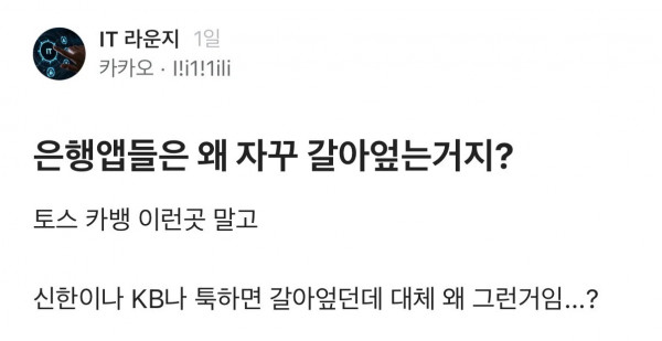 은행앱들은 왜 자꾸 갈아엎는거임? 페이지 정보 작성자 pkg 댓글 0건 조회 255회 작성일 26-04-22 09:10 목록 답변 글쓰기 본문 이전글자동차는 올블랙이 뒤지는 이유 26.04.22 다음글의사가 말하는 천연 위고비 26.04.22 댓글 0 댓글목록 등록된 댓글이 없습니다.