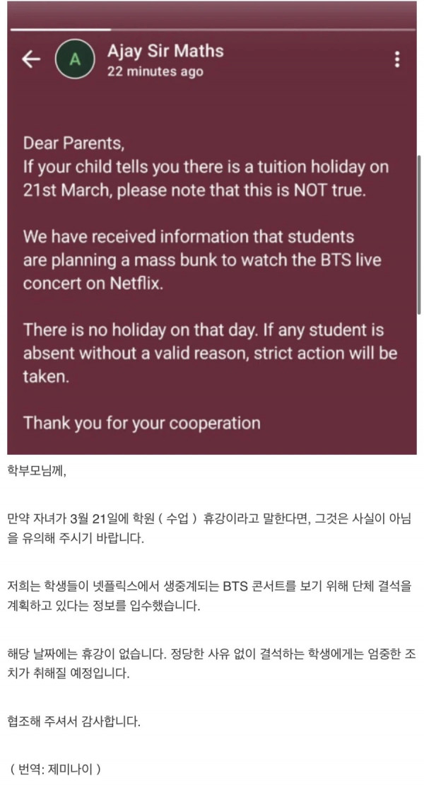 인도의 한 수학학원의 학부모 공지문 페이지 정보 작성자 fiveou 댓글 0건 조회 189회 작성일 26-03-16 15:12 목록 답변 글쓰기 본문 보건결석도 안되고, 친척상도 안되고, 이 안에 배신자가 있다. 이게 내 결론이다. 이전글 이상하게 합격 했다는 사람이 없는 곳 26.03.16 다음글 사람마다 진짜 갈리는 인생 밥상.jpg 26.03.16 댓글 0 댓글목록 등록된 댓글이 없습니다.