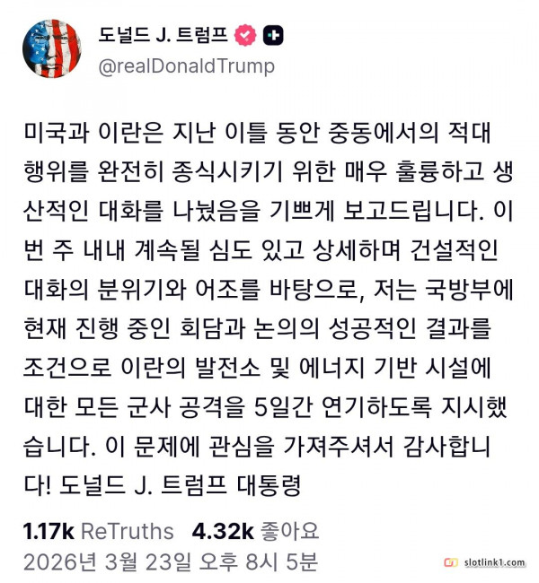 오늘도 타코한 트럼프 페이지 정보 작성자 fiveou 댓글 0건 조회 354회 작성일 26-03-24 03:20 목록 답변 글쓰기 본문 이 트윗이 나온 이후 환율, 유가는 급락하고 코스피 선물 등은 급등함...근데 이란 매체에서 '미국과 직간접적인 접촉이 없었다'는 찌라시가 돌고 있음(진위 여부 불명)? 이전글 로또방이 폐업한 이유 26.03.24 다음글 다가오는 만우절 26.03.23 댓글 0 댓글목록 등록된 댓글이 없습니다.