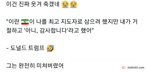 트럼프 : 이란이 나를 최고지도자로 삼으려 했지만 내가 거절했다 페이지 정보 작성자 fiveou 댓글 0건 조회 223회 작성일 26-03-27 07:33 목록 답변 글쓰기 본문 이전글 대AI시대의 웹툰, 웹소설 업계의 대응 26.03.27 다음글 마을에서 말벌을 절대로 버리면 안되는 이유 26.03.27 댓글 0 댓글목록 등록된 댓글이 없습니다.