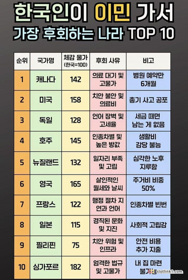 이민가서 가장 후회하는 나라 Top10 페이지 정보 작성자 fiveou 댓글 0건 조회 194회 작성일 26-02-25 11:01 목록 답변 글쓰기 본문 이민가서 가장 후회하는 나라 Top10 이전글 [속보] 트럼프 “관세 체결한 국가도 행복…더 나쁜 합의도 가능” 26.02.25 다음글 미군, 이란 공격에 심각한 차질 발생. 26.02.25 댓글 0 댓글목록 등록된 댓글이 없습니다.