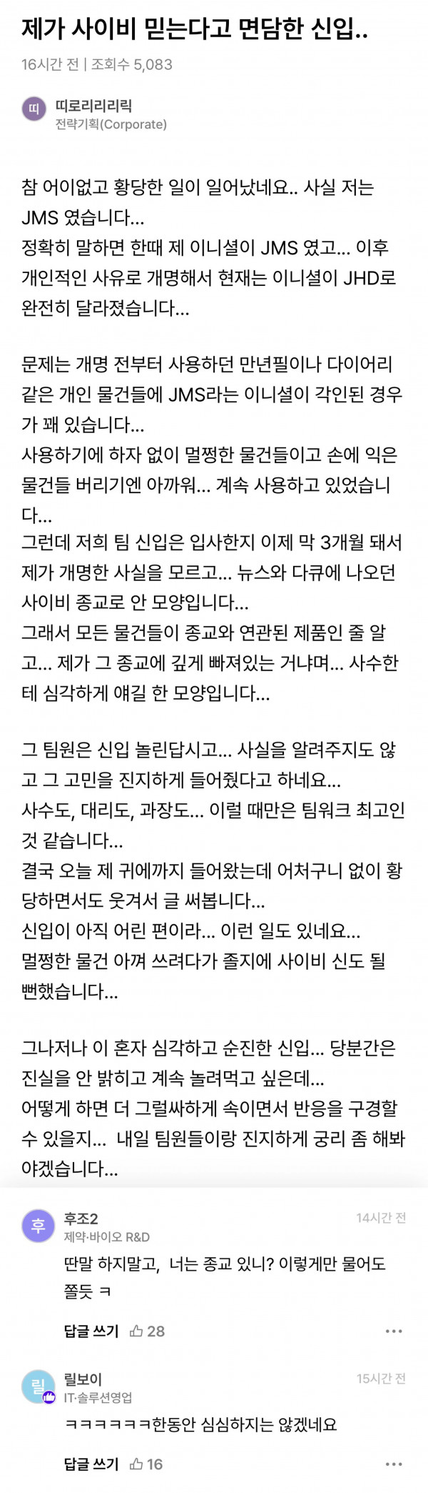 신입에게 사이비로 오해받은 선배의 고민 페이지 정보 작성자 fiveou 댓글 0건 조회 121회 작성일 26-04-29 02:08 목록 답변 글쓰기 본문 어떻게 하면 더 속일 수 있을까 고민 중 이전글지금봐도 정신나간 임진왜란 종전조건 26.04.29 다음글 나 휴양지왔는데 내 악어튜브 위에 진짜 악어가 올라와있어 26.04.29 댓글 0 댓글목록 등록된 댓글이 없습니다.