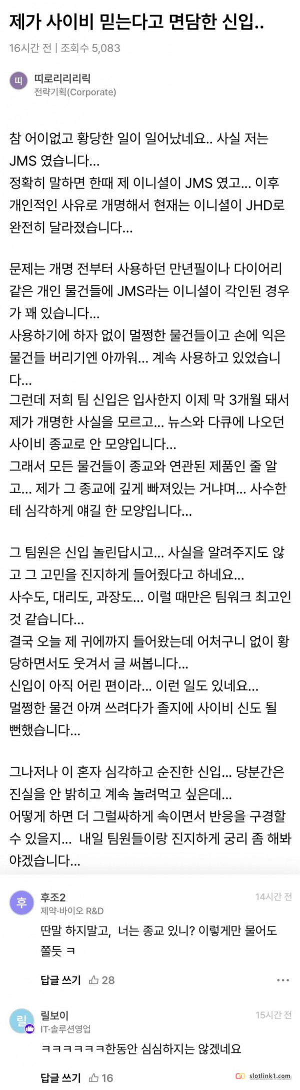 신입사원이 저를 사이비 믿는다고 오해하고 있는것 같습니다 페이지 정보 작성자 pkg 댓글 0건 조회 200회 작성일 26-04-29 10:31 목록 답변 글쓰기 본문 이전글테슬라 보험료가 매년 오르는 이유라는데... 26.04.29 다음글공부하다 2억 받아서 오전 공부 망친 공시생 26.04.29 댓글 0 댓글목록 등록된 댓글이 없습니다.
