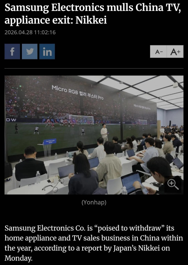 루머) 삼성전자 중국 가전사업 철수 페이지 정보 작성자 pkg 댓글 0건 조회 148회 작성일 26-04-30 05:43 목록 답변 글쓰기 본문 https://pulse.mk.co.kr/m/news/english/12029280삼성전자는 연내 중국 내 가전 및 TV 판매 사업을 "철수할 태세"라고 일본 니케이신문이 월요일 보도했다.보고서는 삼성전자가 이르면 이번 달에 중국 내 판매 중단 여부를 결정할 수 있다고 언급했습니다. 보고서에 따르면, 회사는 사업 파트너와 현지 직원들에게 알린 후 재고를 점진적으로 소진하고 연내 판매를 종료할 계획이다. 루머) 삼성전자 중국 가전사업 철수 이전글디아블로4 확장팩 출시 근황 26.04.30 다음글어르신이 알려주는 진짜 돈 버는법 26.04.30 댓글 0 댓글목록 등록된 댓글이 없습니다.