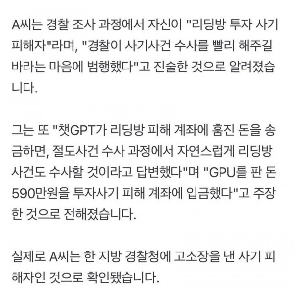 그래픽카드 도둑 비하인드 페이지 정보 작성자 pkg 댓글 0건 조회 121회 작성일 26-02-26 18:30 목록 답변 글쓰기 본문 1. 절도범은 리딩방 피해자 2. 수사가 느려 지피티에게 물어보니 훔친 돈을 송금하면 절도건을 수사하며 같이 수사해 줄 것이라 알려줌 3. 잃을 것도 없으니 실행 다음글한강버스 다음달 전구간 운항 재개…4월부터 급행 신설 26.02.26 댓글 0 댓글목록 등록된 댓글이 없습니다.
