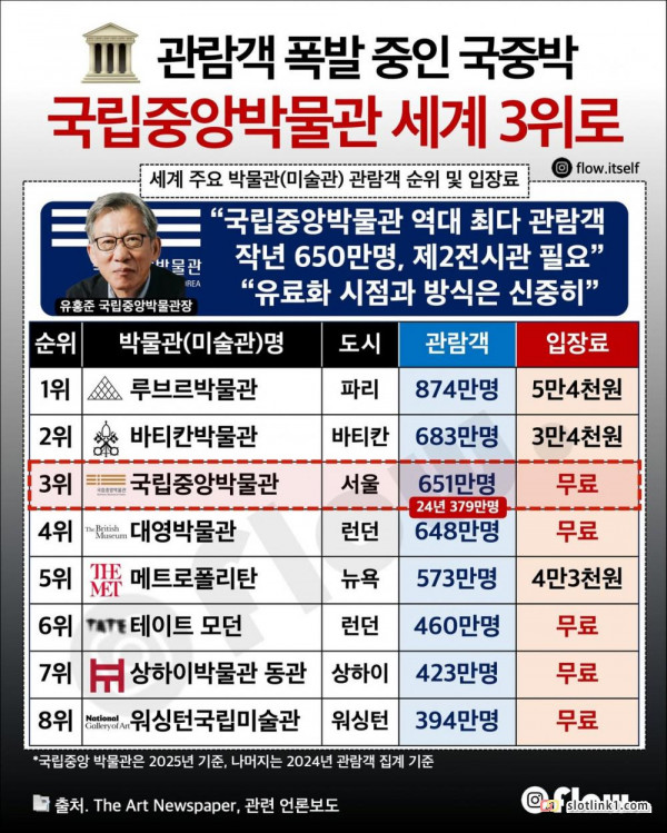 관람객 순위 세계 3위 찍은 국립중앙박물관 페이지 정보 작성자 pkg 댓글 0건 조회 164회 작성일 26-03-10 03:05 목록 답변 글쓰기 본문 이전글논란중인 샤워할 때 위치 26.03.10 다음글2만원으로는 깜빵 안간다는 사기꾼의 최후 26.03.10 댓글 0 댓글목록 등록된 댓글이 없습니다.