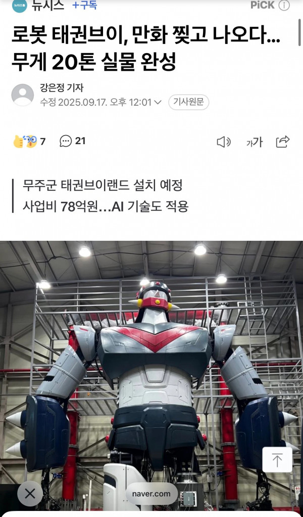 태권브이 20톤 실물제작 근황 페이지 정보 작성자 pkg 댓글 0건 조회 154회 작성일 26-03-21 16:45 목록 답변 글쓰기 본문 https://n.news.naver.com/mnews/article/003/0013486723?sid=101&lfrom=twitter&spi_ref=m_news_x 제발...왜 이딴 짓을.. 이전글2004년 서울 종로2가 풍경 26.03.21 다음글최근 체감상 진짜 개부자 집에 있는 가전제품 근황 26.03.21 댓글 0 댓글목록 등록된 댓글이 없습니다.