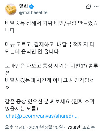 배달앱 중독자가 만든 가짜 배달앱 페이지 정보 작성자 pkg 댓글 0건 조회 201회 작성일 26-03-28 13:32 목록 답변 글쓰기 본문 이전글농심에서 이번에 공개한 신라면 캐릭터 근황 26.03.28 다음글몽골에 수출된 삼겹살 문화 26.03.28 댓글 0 댓글목록 등록된 댓글이 없습니다.