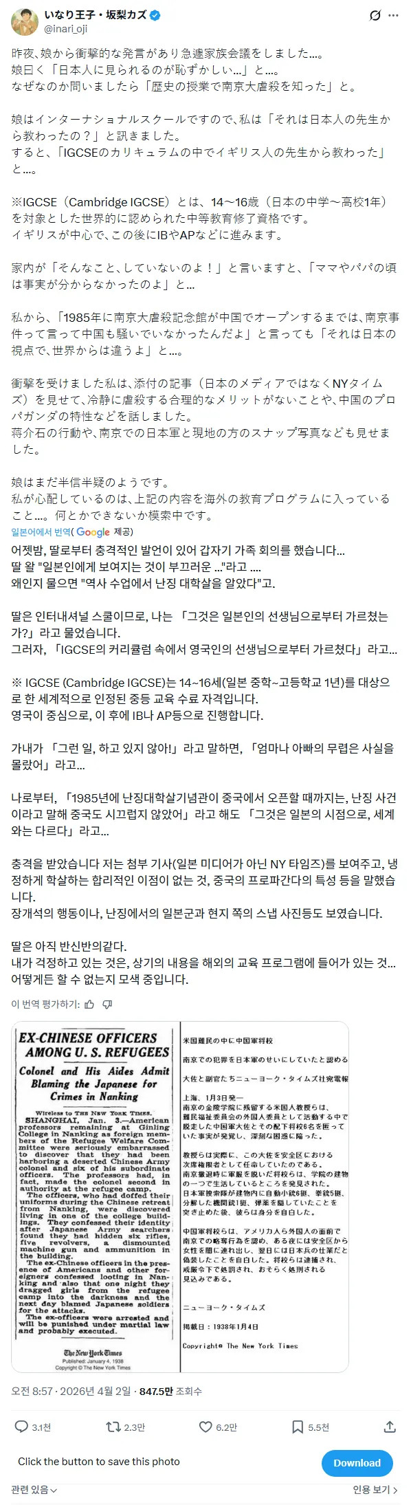 ??? : 딸이 난징대학살을 알아서 걱정됩니다. 페이지 정보 작성자 pkg 댓글 0건 조회 158회 작성일 26-04-05 06:33 목록 답변 글쓰기 본문 이전글내 환자가 죽었는데 인생 별거없는것같다 26.04.05 다음글독신 자산 100억 vs 배우자와 자녀 둘 자산 20억 26.04.05 댓글 0 댓글목록 등록된 댓글이 없습니다.