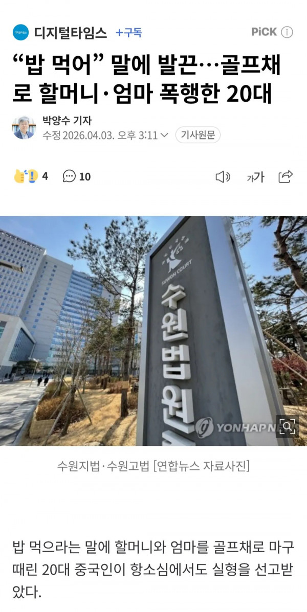 “밥 먹어” 말에 발끈…골프채로 할머니·엄마 폭행한 20대 페이지 정보 작성자 pkg 댓글 0건 조회 162회 작성일 26-04-05 10:39 목록 답변 글쓰기 본문 https://n.news.naver.com/mnews/article/029/0003019807 이전글붉은 사막 고인 비하 논란이 개소리인 이유 26.04.05 다음글Ai로 야짤 만들어서 팔면 안되는이유 26.04.05 댓글 0 댓글목록 등록된 댓글이 없습니다.