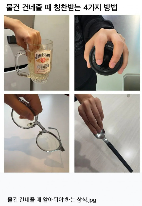 물건 건네줄 때 칭찬받는 4가지 방법 페이지 정보 작성자 pkg 댓글 0건 조회 223회 작성일 26-04-12 00:05 목록 답변 글쓰기 본문 이전글베트남 처녀와 결혼한 회사 아재 26.04.12 다음글깔끔한 코딩의 예 26.04.11 댓글 0 댓글목록 등록된 댓글이 없습니다.