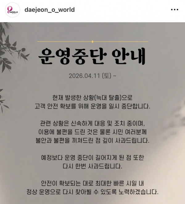 늑대 탈출했던 대전 오월드 근황 페이지 정보 작성자 pkg 댓글 0건 조회 180회 작성일 26-04-12 03:51 목록 답변 글쓰기 본문 오늘부터 늑구 잡을때까지 운영 중단한다함 늑대 탈출했던 대전 오월드 근황 이전글바람을 안 피우는 남자들의 특징 26.04.12 다음글정말 살인날 것 같은 엘리베이터 메모 26.04.12 댓글 0 댓글목록 등록된 댓글이 없습니다.