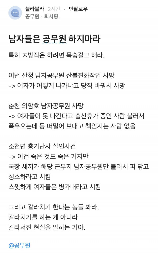 남자들은 공무원 하지마라는 공무원 페이지 정보 작성자 pkg 댓글 0건 조회 188회 작성일 26-04-12 23:55 목록 답변 글쓰기 본문 갈라쳐진 현실 쌉 공감... 남자들은 공무원 하지마라는 공무원 이전글우울증 1년만에 완치한 사람의 경험 공유 26.04.12 다음글"급식 메뉴 가능한 것만 적어주세요!" 26.04.12 댓글 0 댓글목록 등록된 댓글이 없습니다.