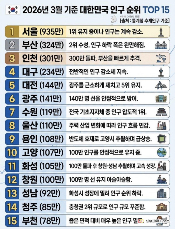 최신자 대한민국 도시 인구 순위 페이지 정보 작성자 pkg 댓글 0건 조회 151회 작성일 26-04-16 01:39 목록 답변 글쓰기 본문 26년 3월 기준 이전글"하이닉스 성과급에 억울하다는 시민" 26.04.16 다음글조니 소말리 판결에 환호하는 일본 반응 26.04.16 댓글 0 댓글목록 등록된 댓글이 없습니다.