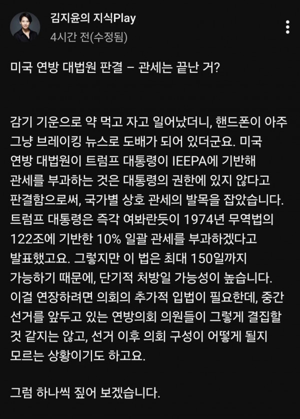 미 관세 판결에 대한 김지윤 박사의 글 페이지 정보 작성자 pkg 댓글 0건 조회 178회 작성일 26-02-22 08:36 목록 답변 글쓰기 본문 미 관세 판결에 대한 김지윤 박사의 글 이전글대한민국 치안 수준 26.02.22 다음글이번 제미나이 3.1 때문에 커뮤니티에 와버린 특이점 26.02.22 댓글 0 댓글목록 등록된 댓글이 없습니다.
