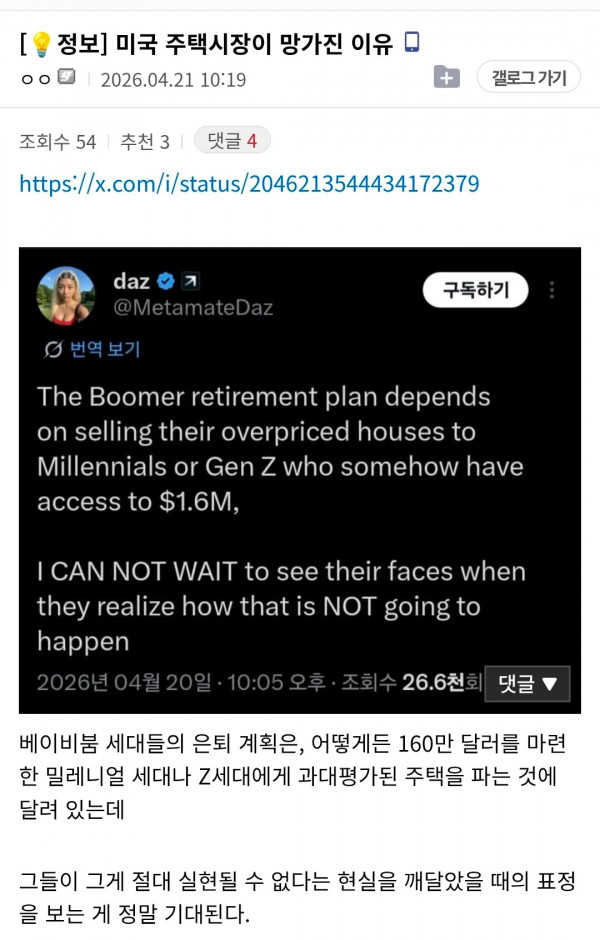 폭락이들이 승리중인 미국 부동산 시장 ㄷㄷ 페이지 정보 작성자 pkg 댓글 0건 조회 206회 작성일 26-04-22 00:55 목록 답변 글쓰기 본문 무주택 청년들이 도저히 집을 살 수 없는 상황'주택가격을 낮춰서라도 매도하겠다 34%' 달성 ㄷㄷ 물론 한국과는 조건들이 다르겠지요 이전글미쳐버린 '한글' 근황ㄷㄷㄷ 26.04.22 다음글미국 'AI 배당금' 법안 나옴 26.04.22 댓글 0 댓글목록 등록된 댓글이 없습니다.